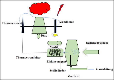 Bei der thermoelektrischen Zündsicherung nutzt man den Effekt, dass bei Berührung von zwei verschiedenen Metallen bei unterschiedlichen Temperaturen an den Berührungspunkten elektrische Spannungen erzeugt werden. Diese unterschiedlichen Temperaturen treten auf, weil die Konstruktion so ausgeführt ist, dass sich der Thermofühler in der Flamme befindet, während die kältere Stelle außerhalb der Flamme liegt. Ein Stromkreis wird über eine Magnetspule geschlossen. Die Ankerplatte ist über einen Stift mit dem Gasventil verbunden, wobei die Schließfeder dazwischen liegt. Die Schließfeder gewährleistet, dass während des Betriebs des Brenners Gas nur gegen die Kraft der Feder strömen kann, bis die magnetische Kraft, die durch den Stromfluss an der warmen Stelle erzeugt wird, größer wird als die Federkraft.