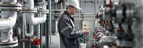 Fachkraft prüft Messdaten und überwacht den Betrieb der Rohrleitungen mithilfe moderner Technologie in einer industriellen Umgebung.